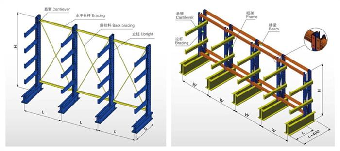 懸臂式貨架是由立柱、柱梁和懸臂組成。立柱采用自動預充孔軋制式雙拼C型專用型鋼作為立柱,以200、140工字鋼作為底梁,柱梁采用專用梯形板并用高強螺栓連接。懸臂梁為雙內折邊C型對焊。懸臂梁與立柱用鍍鋅銷板連接。柱組間用連接件連接。(立柱多采用H型鋼或冷軋型鋼,懸臂采用方管、冷軋型鋼或H型鋼。懸臂與立柱間采用插接式或螺栓連接式,底座與立柱間采用螺栓連接式。)單臂承重可達1000kg以上,特別加固的立柱結構,可以承受2000~3000kg壓力。組合式結構,專用型材立柱,設計背拉增加穩定型,配高強度懸臂(臂可以為單面或雙面),具有結構輕巧、載重能力好、空間利用率高等特點。 懸臂貨架優點